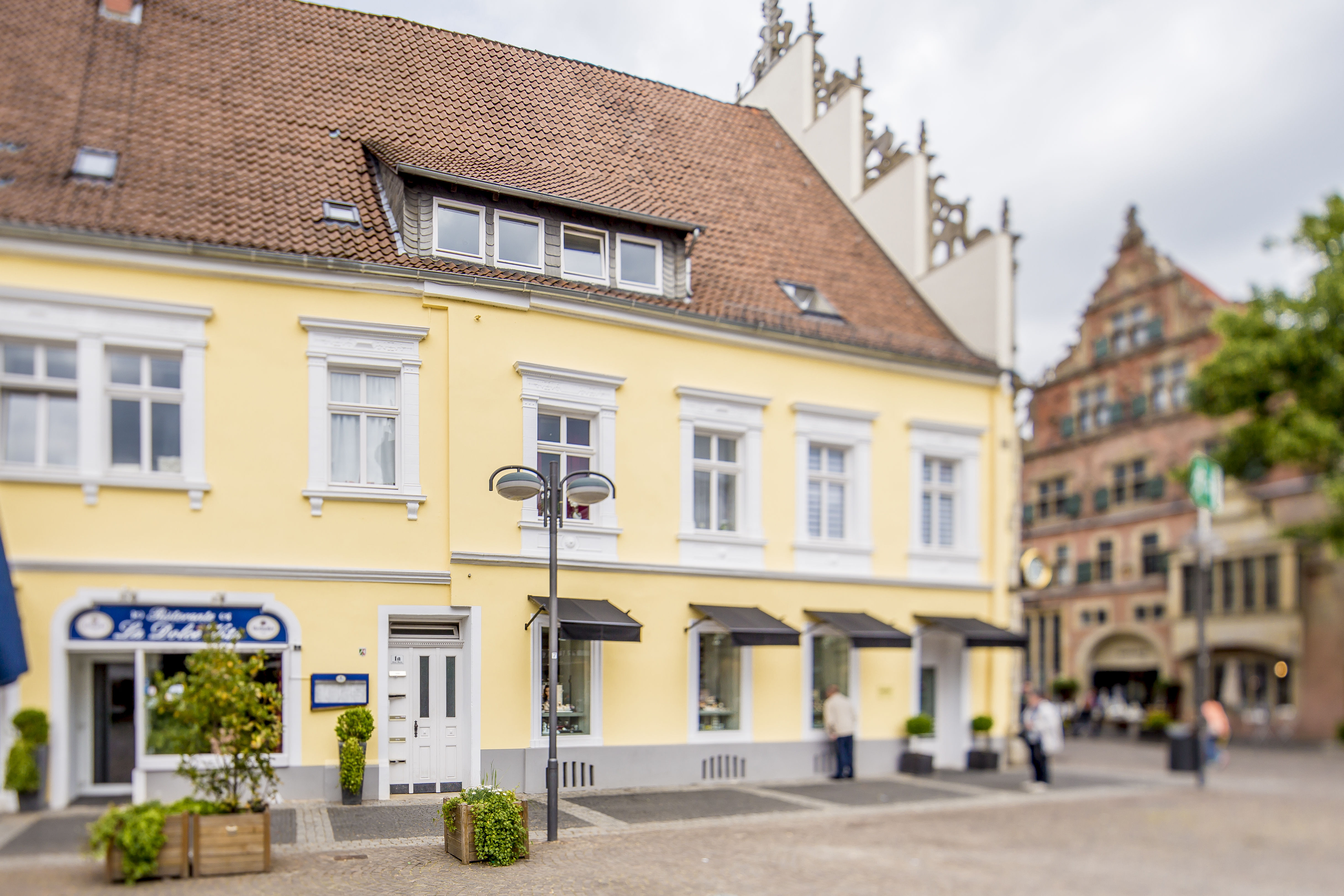 Um feine Risse abzudichten und neuen vorzubeugen, wurde die Fassade dieses denkmalgeschützten Geschäftshauses vor dem Verputzen zunächst mit einem Armierungsgewebe versehen. Putz und Farbe sind, wie es der Denkmalschutz vorsieht, natürlich mineralischer Art.